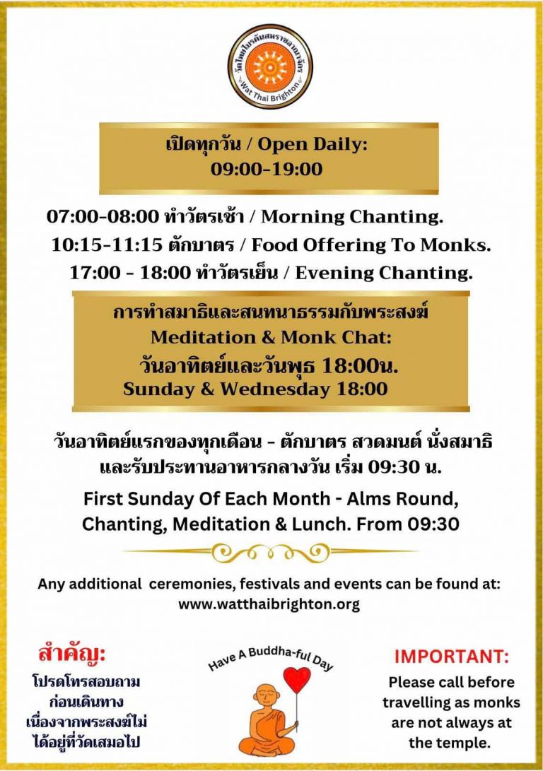 Everyone is welcome to visit our Temple here in Brighton, you do not have to be Buddhist, neither do you have to be Thai, no matter what religion, you are very welcome. You may be interested in finding out more about Buddha Dhamma or join in our twice daily chanting and meditation. Whatever your reason or curiosity, please feel free to get in contact.